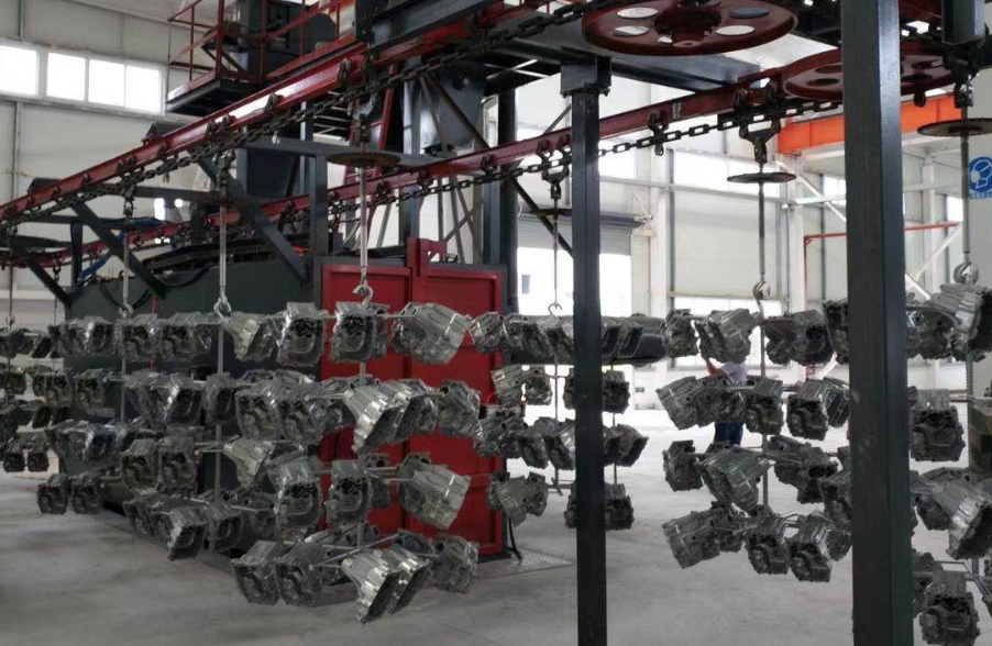 其工作原理是工件隨吊鏈可連續運行、步進運行或采用先進的積放推式懸鏈輸送工件,使工件在裝卸料以及拋丸區分別處于停止狀態,實現定點裝卸和定點拋丸工序,根據工件不同可單點吊重50~2000kg,且生產率高,運行可靠,對各類易吊掛類零件的大批量清理,非常適用。