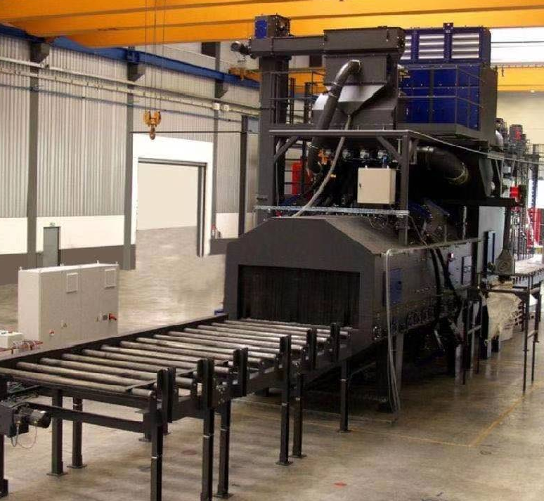穿梭車托盤拋丸機主要是由清理室、室內(nèi)輸送輥道與進出輸送輥道、拋丸器、彈丸循環(huán)系統(tǒng) ( 含提升機、分離器、縱橫螺旋輸送器和供丸管道 ) 、吹掃機構(gòu)、除塵、電氣控制等功能部件組成) 。