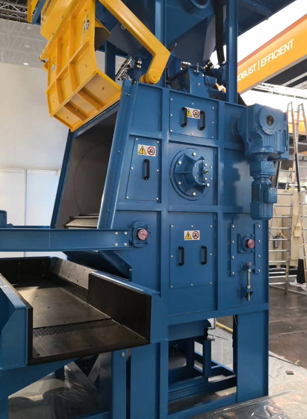 在清理室中加入規定數量的工件后,機器啟動,工件被滾筒帶動,開始翻轉,同時拋丸器高速拋出彈丸形成扇形束,均勻的打擊在工件表面上,從而達到清理的目的,拋出的彈丸及砂粒經橡膠履帶上的小孔,流入底部的鋼板網過篩,經螺旋輸送器送入提升機內,由提升機提到分離器中進行分離,粉塵由風機吸送到除塵器中,經除塵器排除,可定期清除積塵箱中落入的灰塵。廢砂由廢料管流出,用戶可回收利用。丸砂混合物由回丸管回收進入室體,待分離器分離后再用,干凈的彈丸由電磁鐵供丸閘門進入拋丸器拋打工件。
