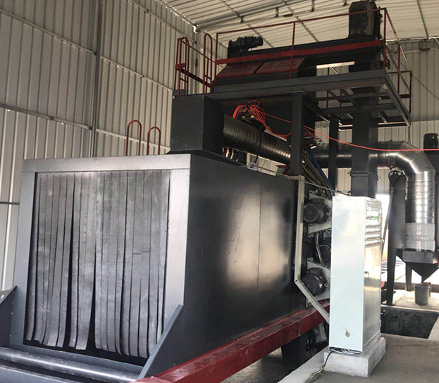 圓鋼、鋼管自動輸人清理室內拋射區時,邊前進邊旋轉的圓鋼、鋼管圓周外表連續不斷地接受縱向拋出高速彈丸流束的打擊與摩擦,使之氧化皮、銹層及異物迅速脫落,顯露出金屬本色。在清理室外,兩邊輥道裝卸工件。清理過程中,撒落下來的丸塵混合物經室體漏斗,縱橫螺旋輸送匯集于提升機下部,再提升到機器上部的分離器里,分離后的好彈丸落人料斗內供拋丸器循環使用;拋丸清理中產生的塵埃,由抽風管送向除塵系統,凈化后排入大氣中,顆粒狀塵埃被捕捉收集。