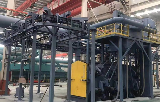 其工作原理是工件隨吊鏈可連續運行、步進運行或采用先進的積放推式懸鏈輸送工件,使工件在裝卸料以及拋丸區分別處于停止狀態,實現定點裝卸和定點拋丸工序,根據工件不同可單點吊重50~2000kg,且生產率高,運行可靠,對各類易吊掛類零件的大批量清理,非常適用。