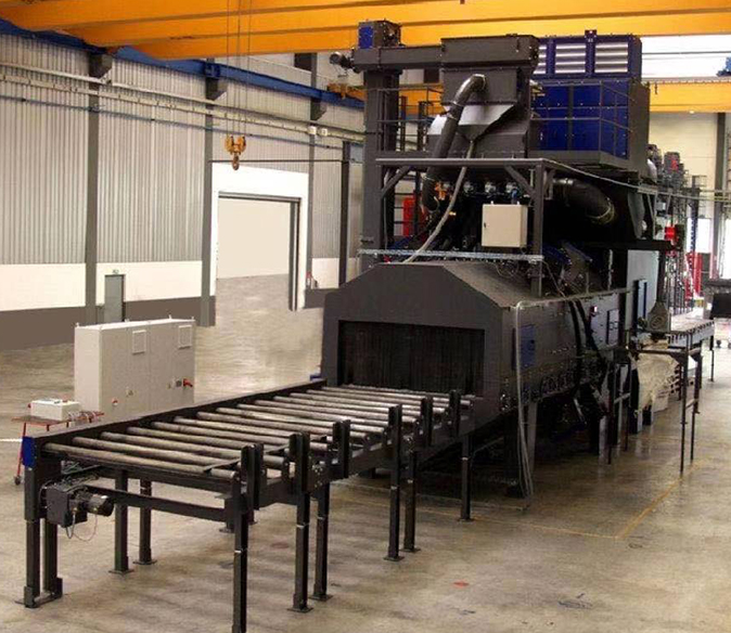鋼板通過式拋丸清理機可對鋼板、型材進行一次性通過清理。不但可以去除工件表面的銹蝕,清理掉鋼板型材氧化皮、結構件上的焊渣,還可以消除工件的焊接應力,提高工件的抗疲勞強度,增加工件噴漆時的漆膜附著力,并達到提高表面及內在質量的目的。