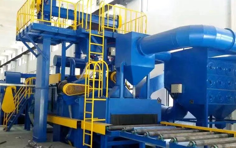 拋丸機除銹原理:在清理過程中由電器控制可調速的輸送輥道將鋼結構件或鋼材送進清理機室體內拋射區,其周身各面受到來自不同坐標方位的強力密集彈丸打擊與磨擦,使之其上的氧化皮、銹層及其污物迅速脫落,鋼材表面就獲得一定粗糙度的光潔表面,在清理室外兩邊進出口輥道裝卸工件。落入鋼材上面的彈丸與銹塵經吹掃裝置吹掃,撒落下來的丸塵混合物由回收螺旋輸送到室體漏斗、縱橫向螺旋輸送機匯集于提升機下部,再提升到機器上部的分離器里,分離后的純凈彈丸落入分離器料斗中內,供拋丸循環使用。拋丸清理中產生塵埃,由抽風管送向除塵系統,凈化處理后的凈氣排放到大氣中,顆粒狀塵埃被捕捉收集。