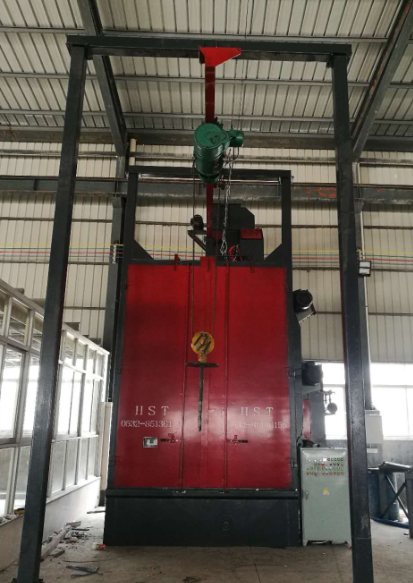 吊鉤式拋丸機分為單吊鉤和雙吊鉤,吊鉤式拋丸機由兩個吊鉤裝載工件交替進入拋丸清理室內(nèi)。利用拋丸器將0.2~0.8的彈丸拋向工件的表面,使得工件的表面達到一定的粗糙度,讓工件變得美觀,或者改變工件的壓應(yīng)力提高壽命。