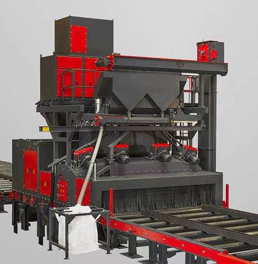 2、拋丸器布置形式為多角度,選用了大拋丸量、大功率雙園盤高效拋丸器,拋丸器的布置經(jīng)過計(jì)算機(jī)三維動(dòng)態(tài)模擬,處理工件的所有截面都能得到彈丸的直射。