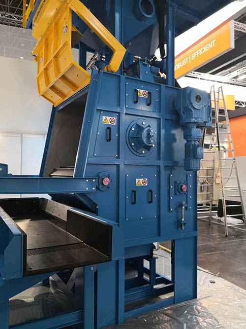 5.展帶式拋丸機完全停止后,打開加料門,將工裝及工件吊出。